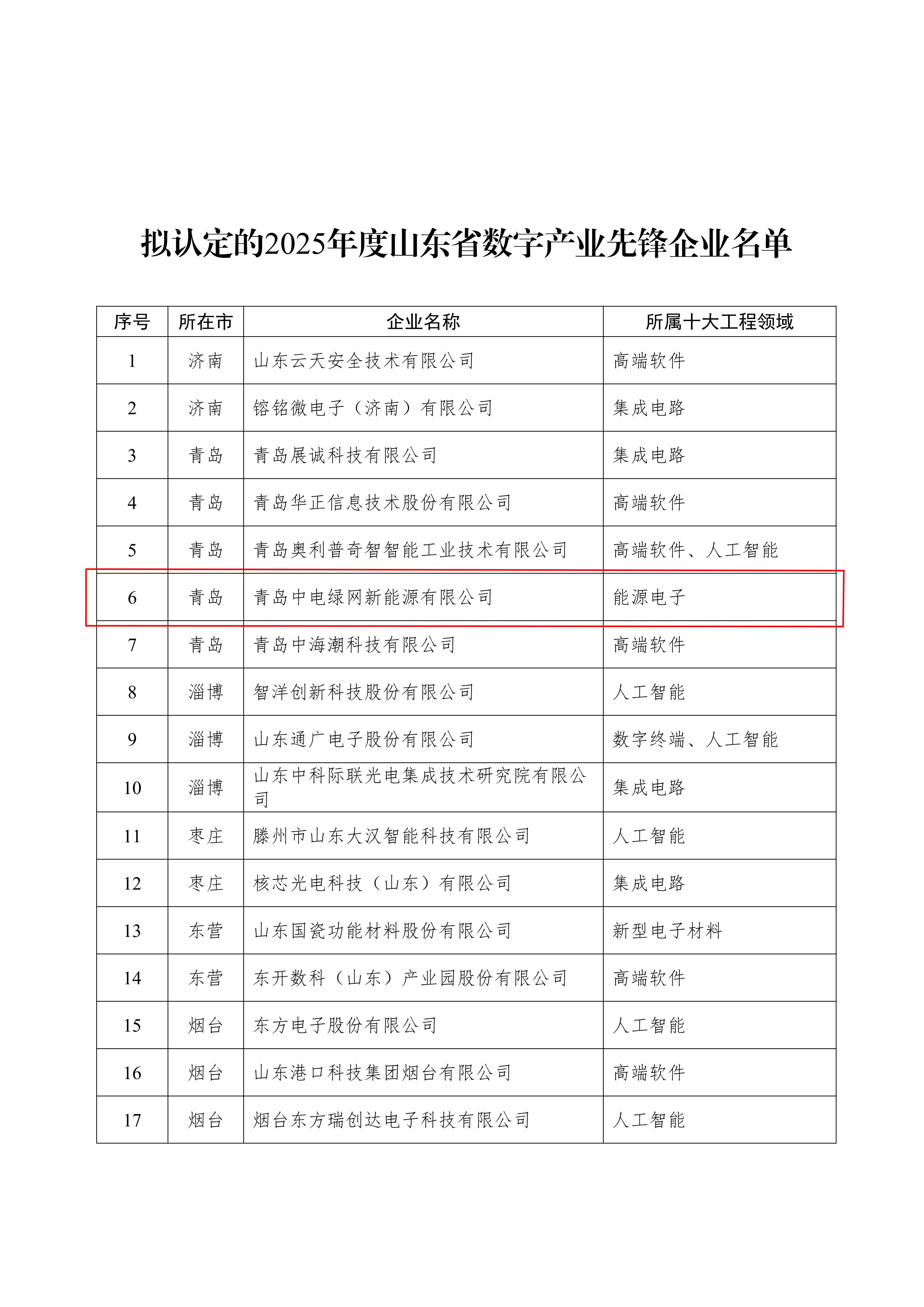 2025年8月25日,山東省工業(yè)和信息化廳公布“2025年度山東省數(shù)字產業(yè)先鋒企業(yè)”名單,全省共26家企業(yè)入選,青島中電綠網新能源有限公司位列其中。公司憑借在新型電力系統(tǒng)數(shù)字化、源網荷儲一體化及新能源微電網領域的創(chuàng)新成果,成為青島市唯一以“新能源+數(shù)字化”雙輪驅動獲此殊榮的企業(yè)。這一榮譽標志著公司在數(shù)字能源領域的技術創(chuàng)新與市場實踐再獲省級權威認可。